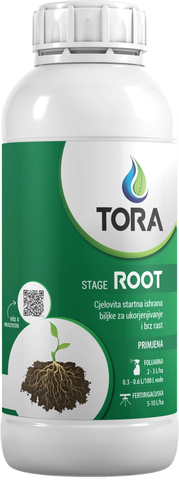 TORA ROOT ima brzo i jako djelovanje zbog sadržaja bioaktivnih komponenata (ekstrakta algi i odabranih aminokiselina). Istovremeno, dominantna količina fosfora omogućuje da se rast i razvoj korijena i biljke odvijaju neometano. U proizvodu je jedino fosfor u anionskom obliku (PO4) bez konkurencije drugih aniona što ga čini lako dostupnim.