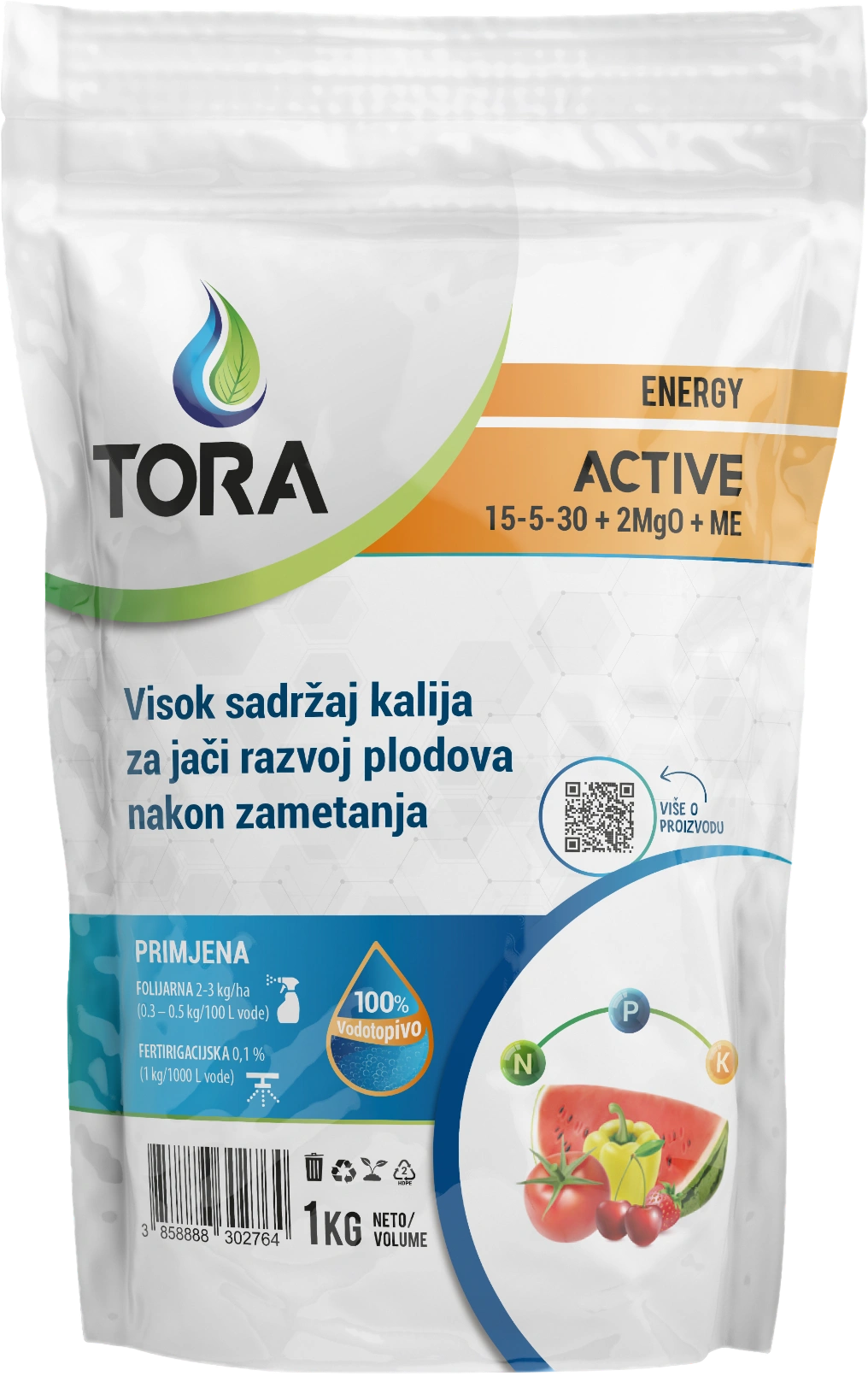 TORA ACTIVE AFP je proizvod koji ima biostimulirajuću ulogu i izuzetno je pogodan za ujednačeno sazrijevanje, kvalitetnu pigmentaciju i sadržaj suhe tvari u plodovima. Kalij garantira visok sadržaj šećera u plodovima, bolje naljevanje zrna (visoki hektolitar) i otpornost na sušu. Prema potrebama različitih biljnih vrsta, ova formulacija se može kombinirati s ostalim proizvodima iz Energy linije kako bi se dobio određeni odnos NPK elemenata. Koristi se najvećim dijelom vegetacije, osigurava ranostasnost i produžava period eksploatacije biljaka. Koristi se kroz veći dio vegetacije, osigurava ranije dozrijevanje plodova i produžava period eksploatacije biljaka. Ovoj formulaciji je potrebno dodavati kalcij, ali u znatno manjoj mjeri nego drugim sličnim formulacijama, a posebno u tvrdim karbonatnim vodama.