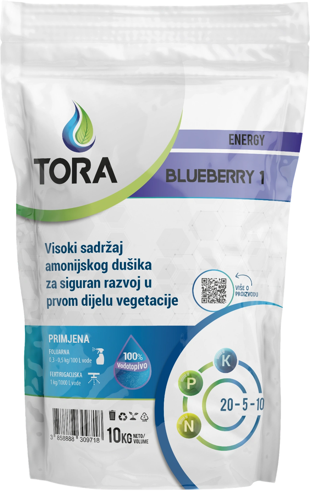 TORA BLUEBERRY 1 primjenjuje se u prvom dijelu vegetacije do precvjetavanja borovnica, kada su potrebe za dušikom veće.