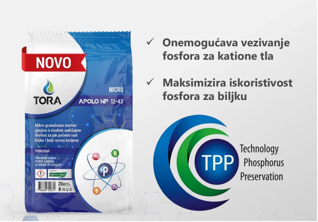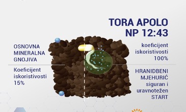 TORA APOLO NP 12:43 karakterizira: visoka topivost fosfora u vodi 95 – 97 %, koeficijent iskoristivosti fosfora od gotovo 100 %, ujednačena veličina granula 0,5 – 1 mm, mikro elementi su u formulacijama koje osiguravaju topivost u vodi. Posebna patentirana koformulacija (TPP) jamči stabilnost granule u procesima skladištenja i postupnu, ali potpunu topivost granule u zoni korijena u kojoj su ciljani elementi usvojivi od strane biljke. TPP – Technology Phosphorus Preservation je inovativna tehnologija čuvanja fosfora, radi se o koformulaciji koja spriječava retrogradaciju i blokiranje fosfora, temeljem ove tehnologije osiguran je spomenuti koeficijent iskoristivosti fosfora od 100 %. Mikro lokalizirana primjena granula oko sjemnke i korijenčića vrlo brzo formira hranidbeni mjehurić (slika 1.) pomoću kojeg biljka dobiva sve potrebne elemente za dobar početni rast i razvoj. Na taj način TORA APOLO NP 12:43 osigurava brzo i ujednačeno klijanje/nicanje, bolji razvoj korijena koji povećava otpornost na sušne periode te indirektno povećava otpornost na štetne organizme (slika 2.). TORA startno gnojivo sadrži: fosforov (V) oksid: 43%, ukupni dušik: 12%, magnezijev oksid: 2 %, sumporov (III) oksid 11 % i cink 0,7 %. Prvenstveno je namijenjeno ratarskim i povrtlarskim kulturama te se primjenjuje u dozi 20-40 kg/ha, ovisno o kulturi i tipu tla. Također, gnojivo se može primjenjivati i u višegodišnjim nasadima u dozi 20 – 50 kg /ha.