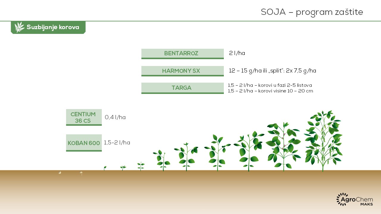 S nedavnim zabranama herbicida nas bazi s-metolaklora te najavljenom zabranom metribuzina, proizvođači soje suočavaju se s ozbiljnim izazovima u zaštiti od korova. Unatoč ograničenjima, dokazana rješenja postoje. Kombinacija herbicida KOBAN 600 i CENTIUM 36 CS dokazano riješava cjelokupan spektar uskolisnih i širokolisnih korova u soji. Obzirom da se radi o zemljišnoj kombinaciji za adekvatnu aktivaciju i učinkovitost apliciranih herbicida potrebno je 20 mm oborina 10-15 dana nakon aplikacije. U slučaju izostanka oborina, učinak sredstava biti će smanjen te će vjerojatno trebati odraditi korektivni tretman s nekim od post-em herbicida za soju: BENTARROZ, HARMONY SX, TARGA.